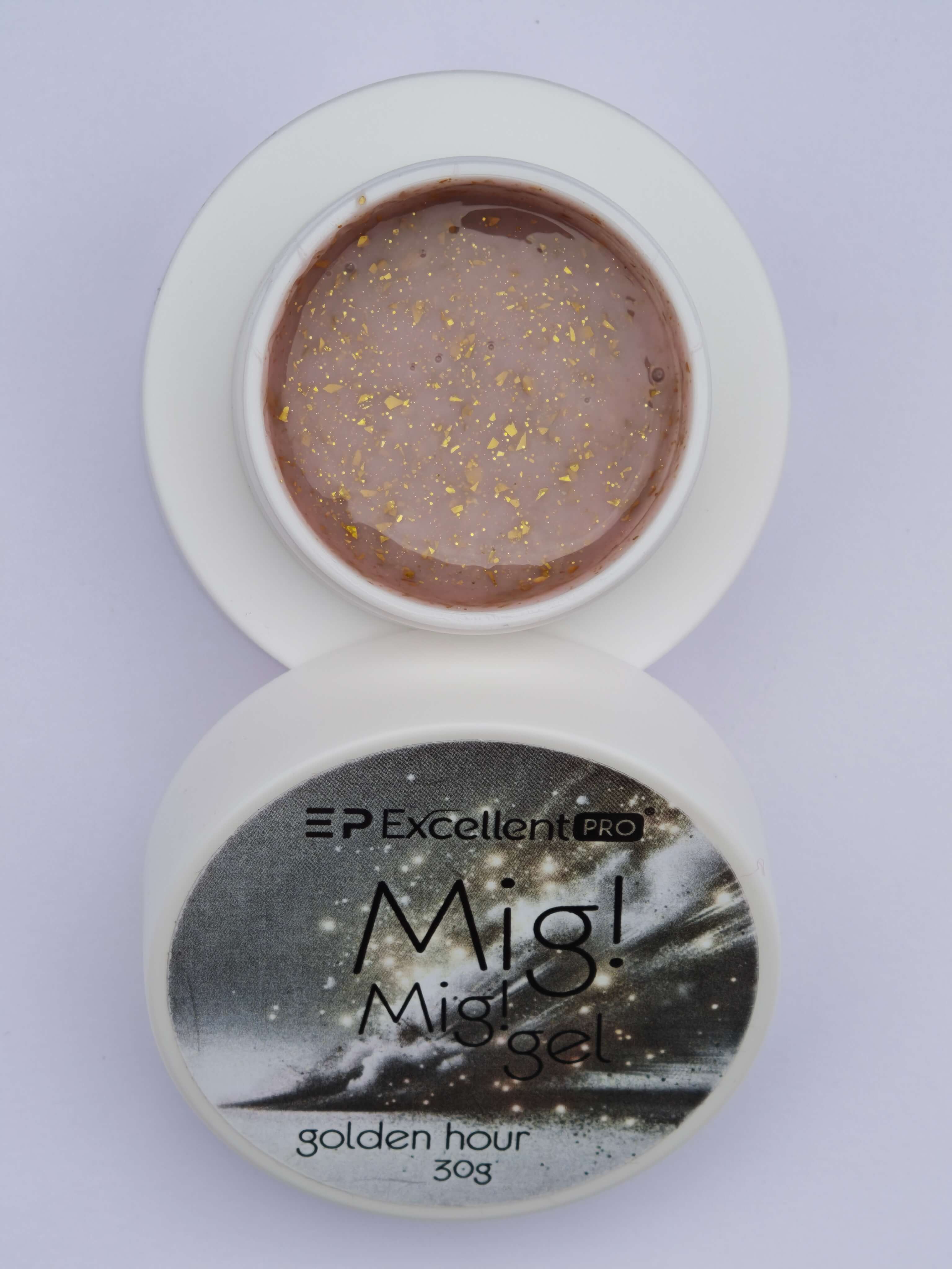 EXCELLENT PRO MIG! MIG! GEL GOLDEN HOUR – je jednofázový pružný gél v ružovo-béžovej farbe s kúskami zlatej fólie, ktorý bude výborným produktom na rýchle doplnenie. Veľmi rýchly samonivelačný gél s riedkou konzistenciou vám umožní robiť nechty expresným tempom. Ideálne na vyrovnávanie a spevnenie prírodných nechtov. VYNIKAJÚCI PRO MIG! MIG! GEL je produkt, ktorý dobre funguje metódou bez pilovania. Gél odolný voči poškodeniu s výbornou priľnavosťou zaistí, že váš styling vydrží dlhé týždne nosenia. Výrobok neobsahuje HEMA, di-HEMA a TPO.