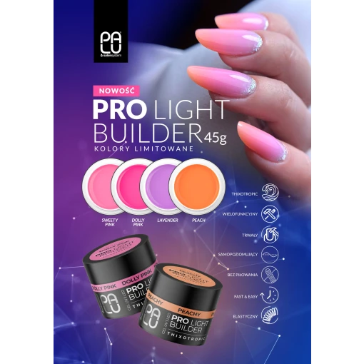 PRO LIGHT BUILDER GEL je multifunkčný gél určený na profesionálne salónne použitie. Špeciálna receptúra bola vyvinutá na základe skúseností nechtových stylistiek s cieľom zrýchliť a zjednodušiť každodennú prácu. Tixotropia v kombinácii s výbornými samovyrovnávacími vlastnosťami zaručuje dokonalú, nekvapkajúcu kvapku a maximálnu kontrolu pri modelácii.
